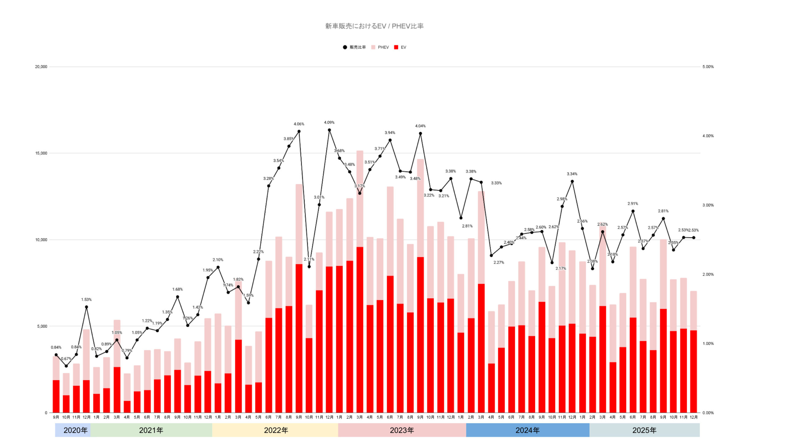2025年12月時点での最新データによると、EV・PHEVの新車販売比率は2.53%でした。前年同月の3.34%から減少しています。